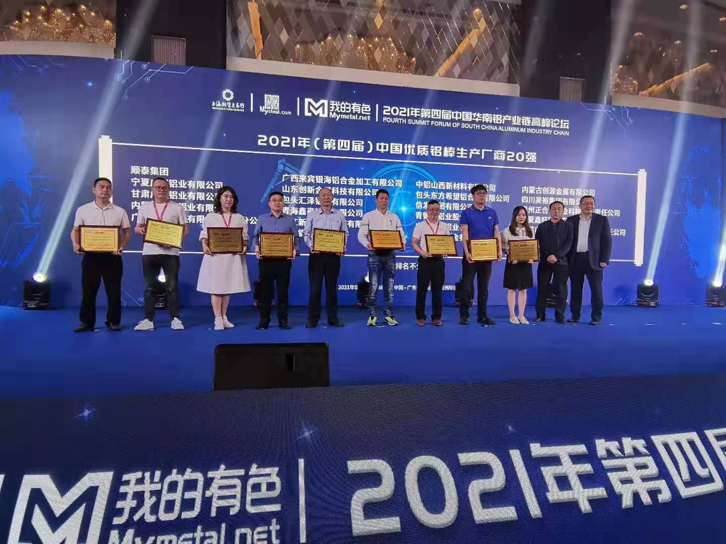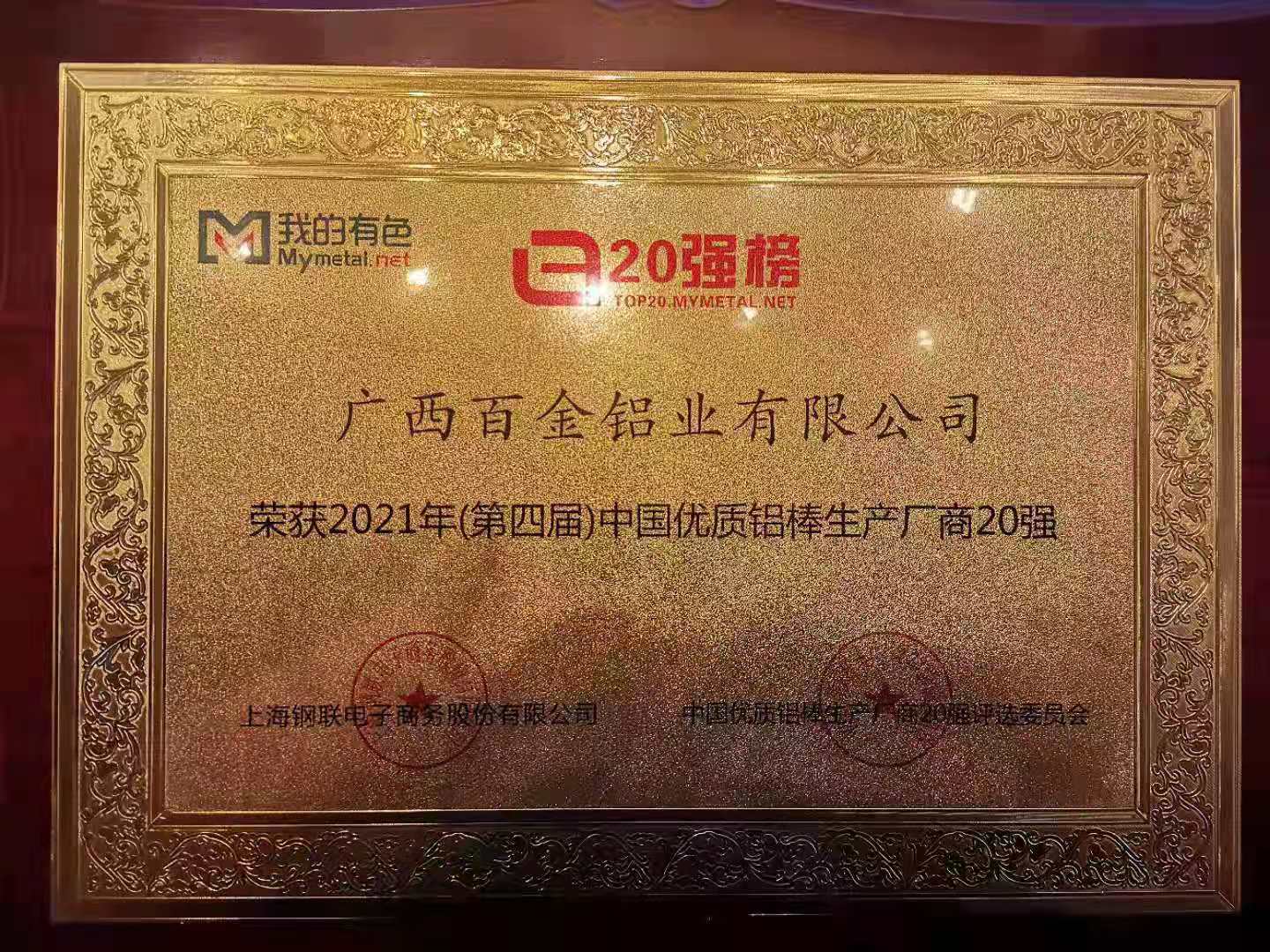 百金鋁業(yè)喜獲“2021年(第四屆)中國優(yōu)質(zhì)鋁棒生產(chǎn)廠商20強(qiáng)”榮譽(yù)稱號