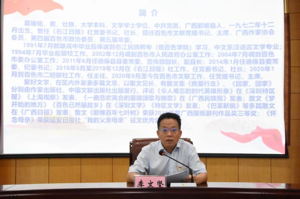 ▲百色市政協(xié)委員會(huì)宣講團(tuán)成員、市文聯(lián)主席、黨組書記莫維銘作宣講報(bào)告